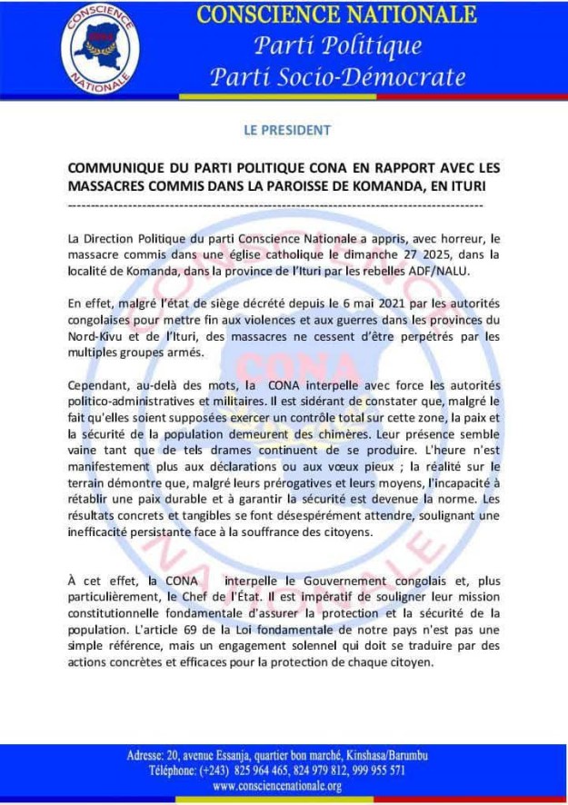 Le Parti politique Conscience Nationale (CONA), par la voix de son président national Matthieu Luboya, a vivement réagi aux massacres perpétrés le dimanche 27 juillet 2025 dans une église catholique de Komanda, en Ituri. L’attaque, attribuée aux rebelles ADF/NALU, a une nouvelle fois plongé la région dans l’horreur.