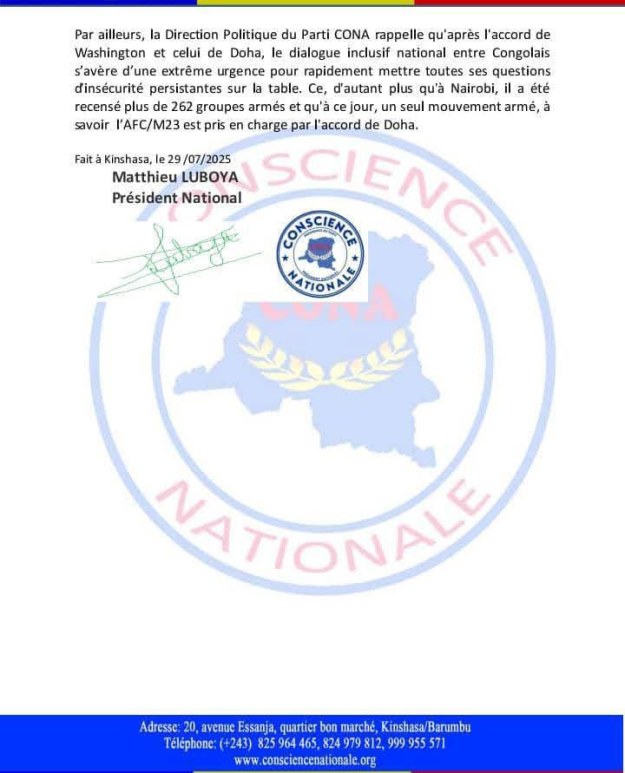 Le parti souligne également l’urgence d’un dialogue national inclusif entre Congolais, afin de traiter en profondeur les causes de l’insécurité. Matthieu Luboya rappelle que, malgré les accords de Washington et de Doha, seuls des engagements partiels ont été respectés. À ce jour, plus de 262 groupes armés sont recensés, et un seul – le M23/AFC – est formellement concerné par le processus de Doha.