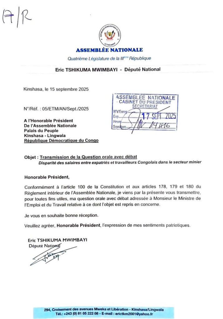 Le député national Éric Tshikuma a interpellé le Ministre de l’Emploi, du Travail et de la Prévoyance sociale à travers une question orale avec débat déposée peu après l’ouverture de la session parlementaire. L’élu attire l’attention du gouvernement sur les inégalités salariales persistantes entre travailleurs expatriés et Congolais dans le secteur minier, qu’il qualifie de « pilier stratégique de l’économie nationale ».
