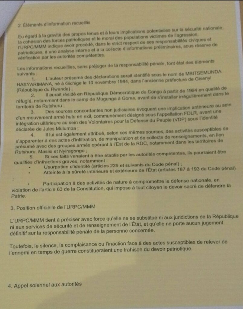 L’URPC/MMM estime que ces propos portent atteinte à l’honneur et à la crédibilité d’une institution légalement établie, ainsi qu’à celle de son coordonnateur, le lieutenant-général Padiri Bulenda David, officier supérieur des Forces armées de la République démocratique du Congo (FARDC).