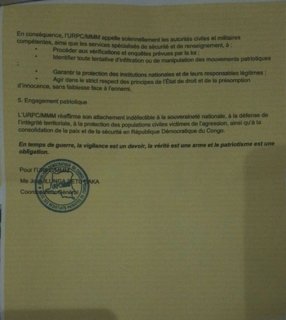 Signé par son coordonnateur général, Me José Ilunga Betu Baka, le document indique que le mouvement a pris connaissance de déclarations publiques diffusées sur la chaîne YouTube « HK Today », attribuées à un individu se présentant, selon l’URPC/MMM, abusivement comme porte-parole des Wazalendo.